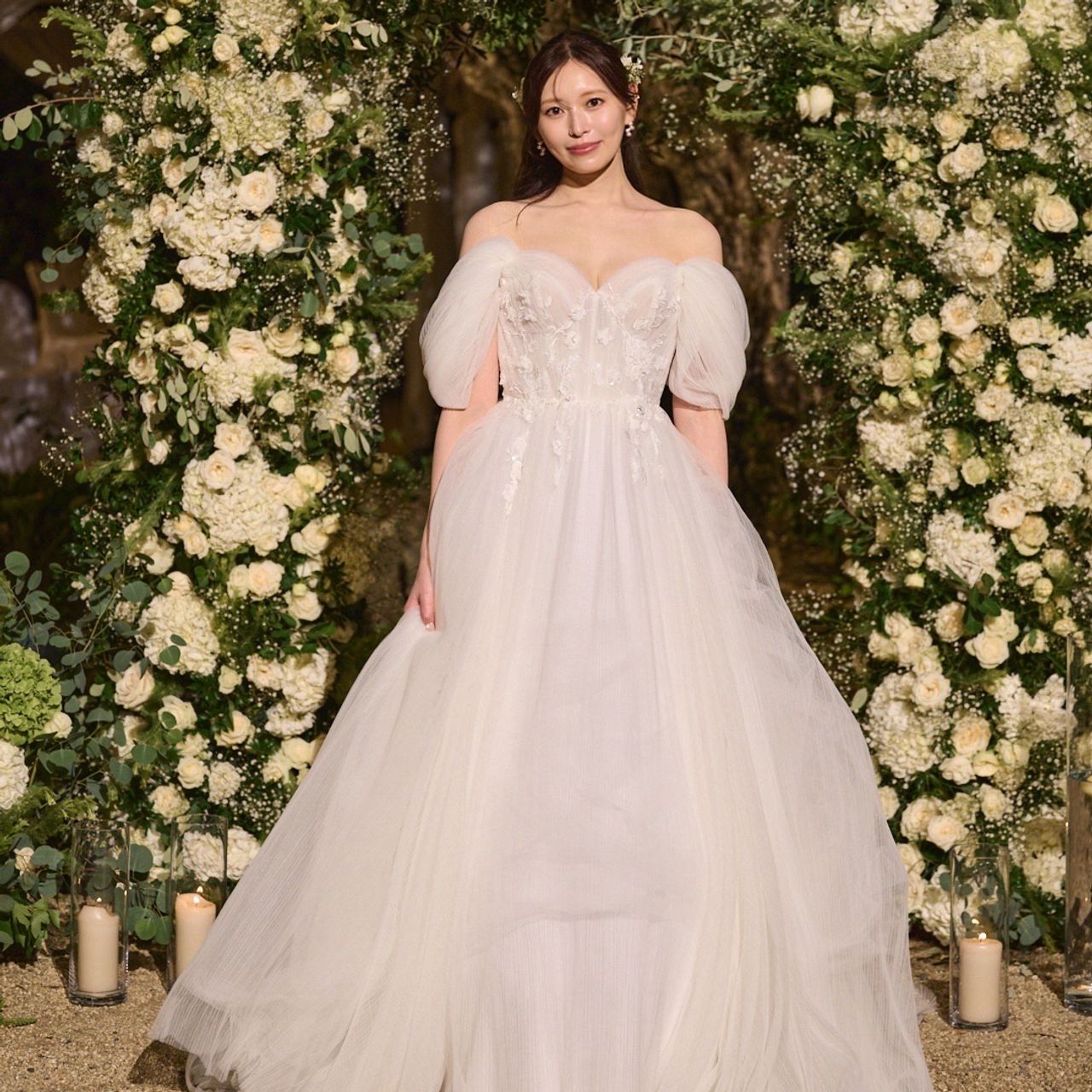 Authentiqueさんでお借りしたALENA LEENAのものです。2着目はふんわりとした可愛らしい妖精のような雰囲気を目指していたため、こちらにときめきました。