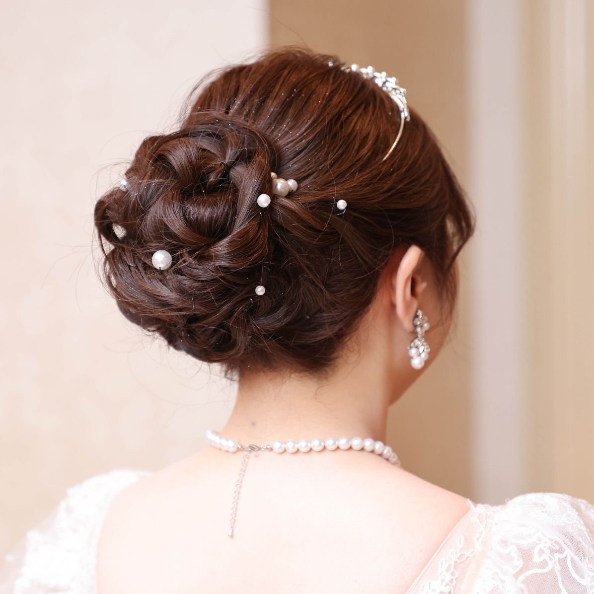 あまりボリュームを出しすぎず、でもフワッとまとめてもらい、パールピンを飾った上にラメスプレーを全体にかけています。