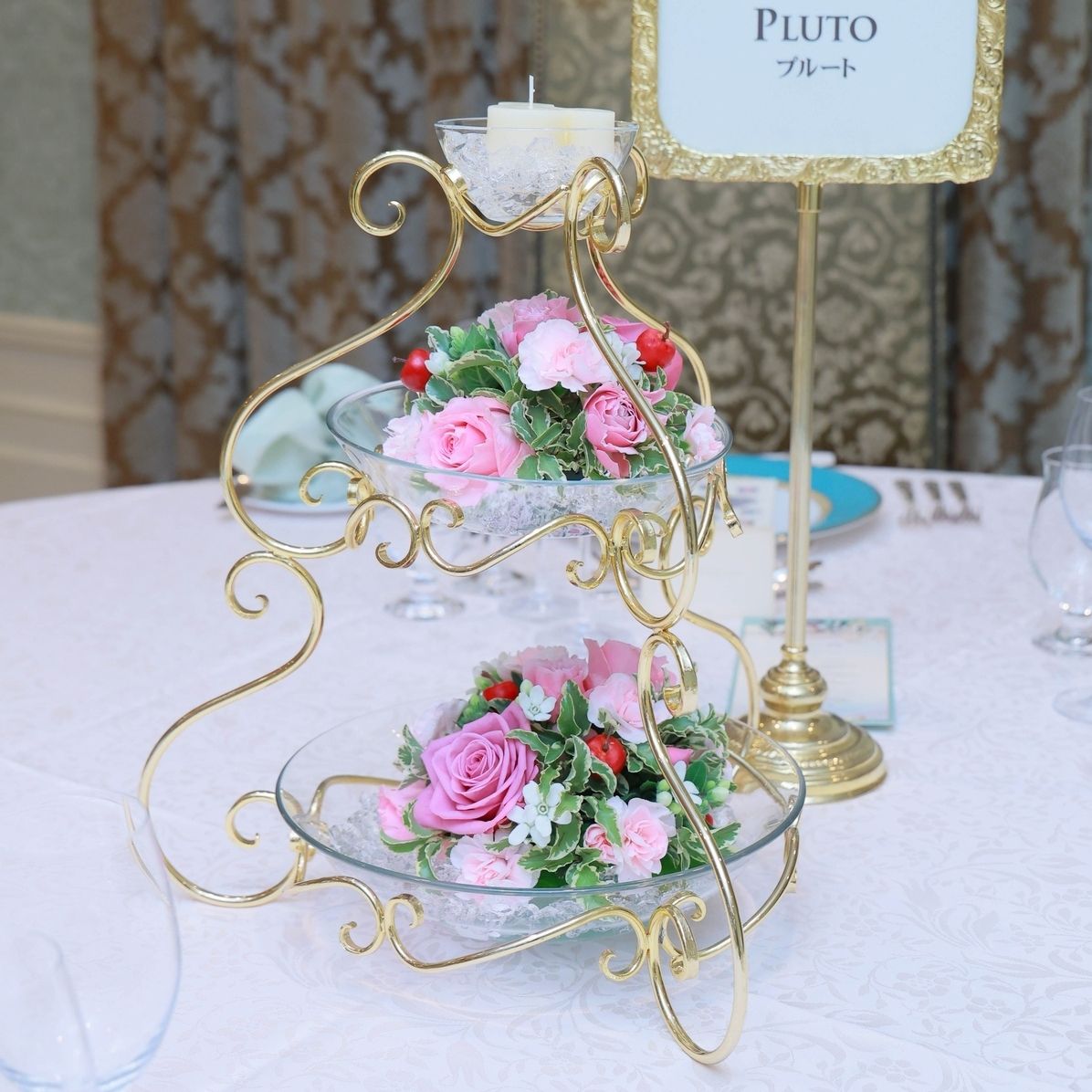 テーブルの装花はフィリグリーのピンクを選んでいます。