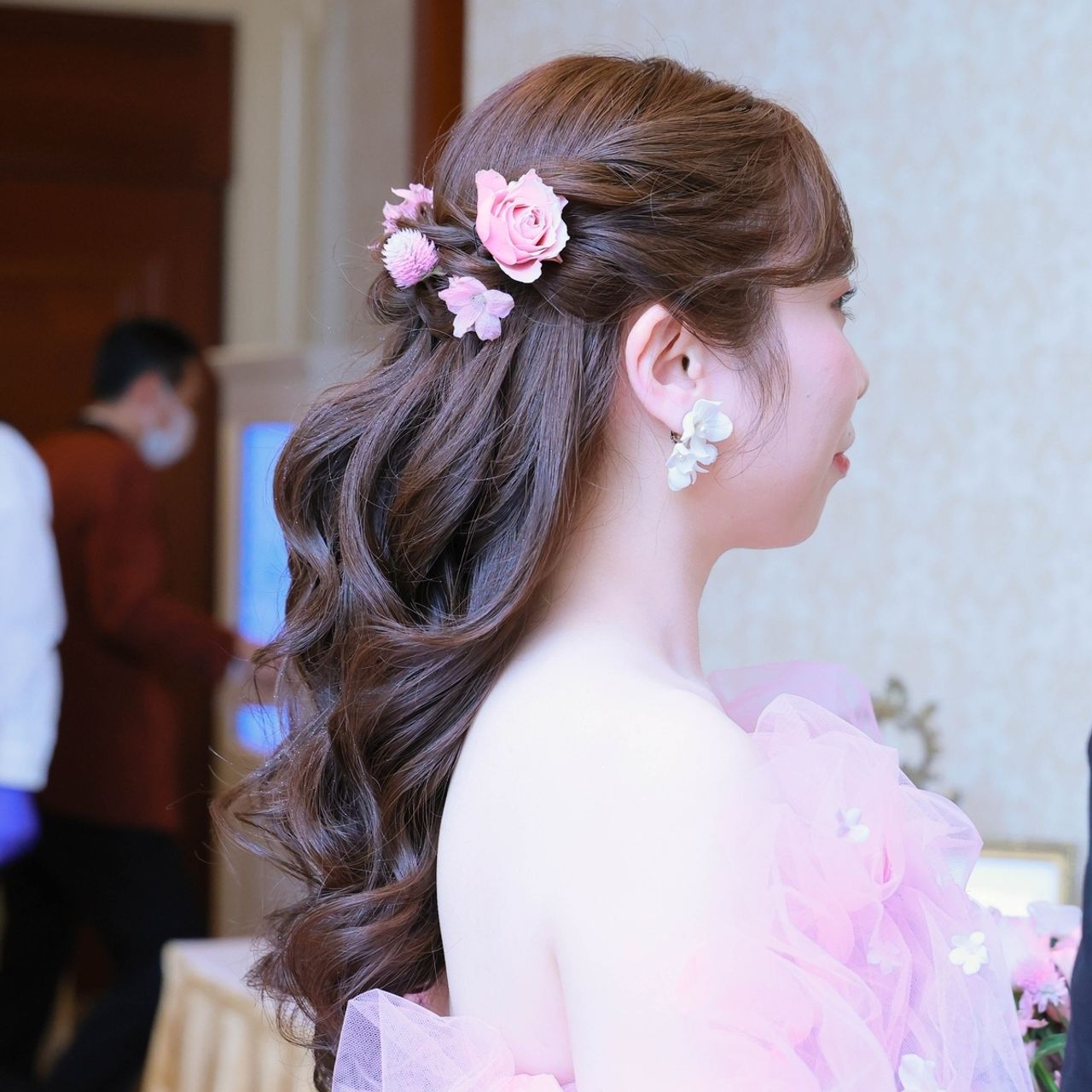 カラードレス用にはブーケで使用しているものと同じお花でヘアードフラワーを用意してもらいました。