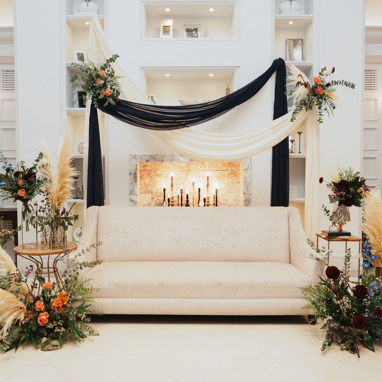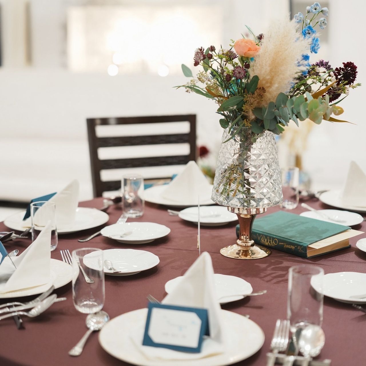 披露宴のテーブルは、夫が好きなボルドーを基調とした華やかなテイストです。高砂は秋らしい色味を取り入れて、リボンを使用したシックなコーディネートにしました。