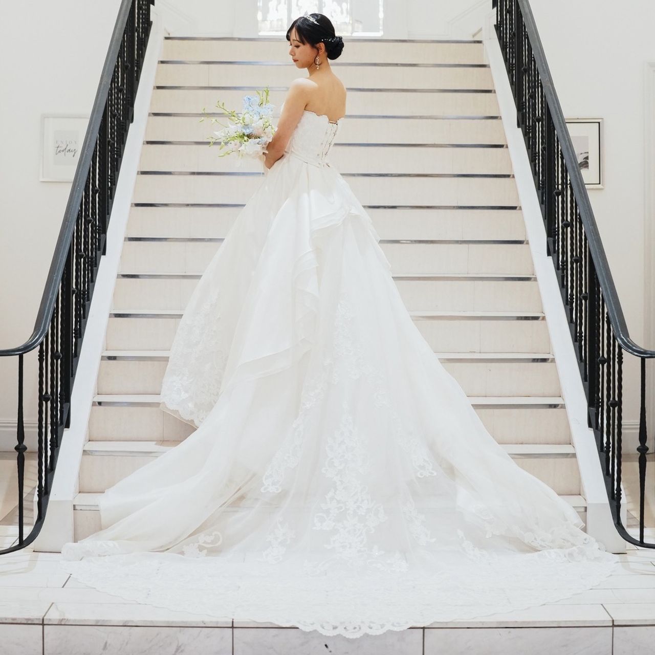 挙式から披露宴中座までの1着目では、しっかりとした印象にしたかったため、アップスタイルにまとめてティアラを着用しました。
