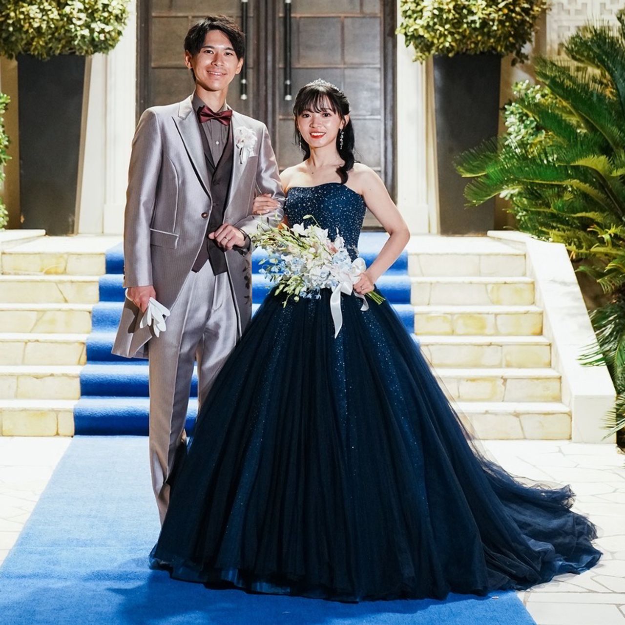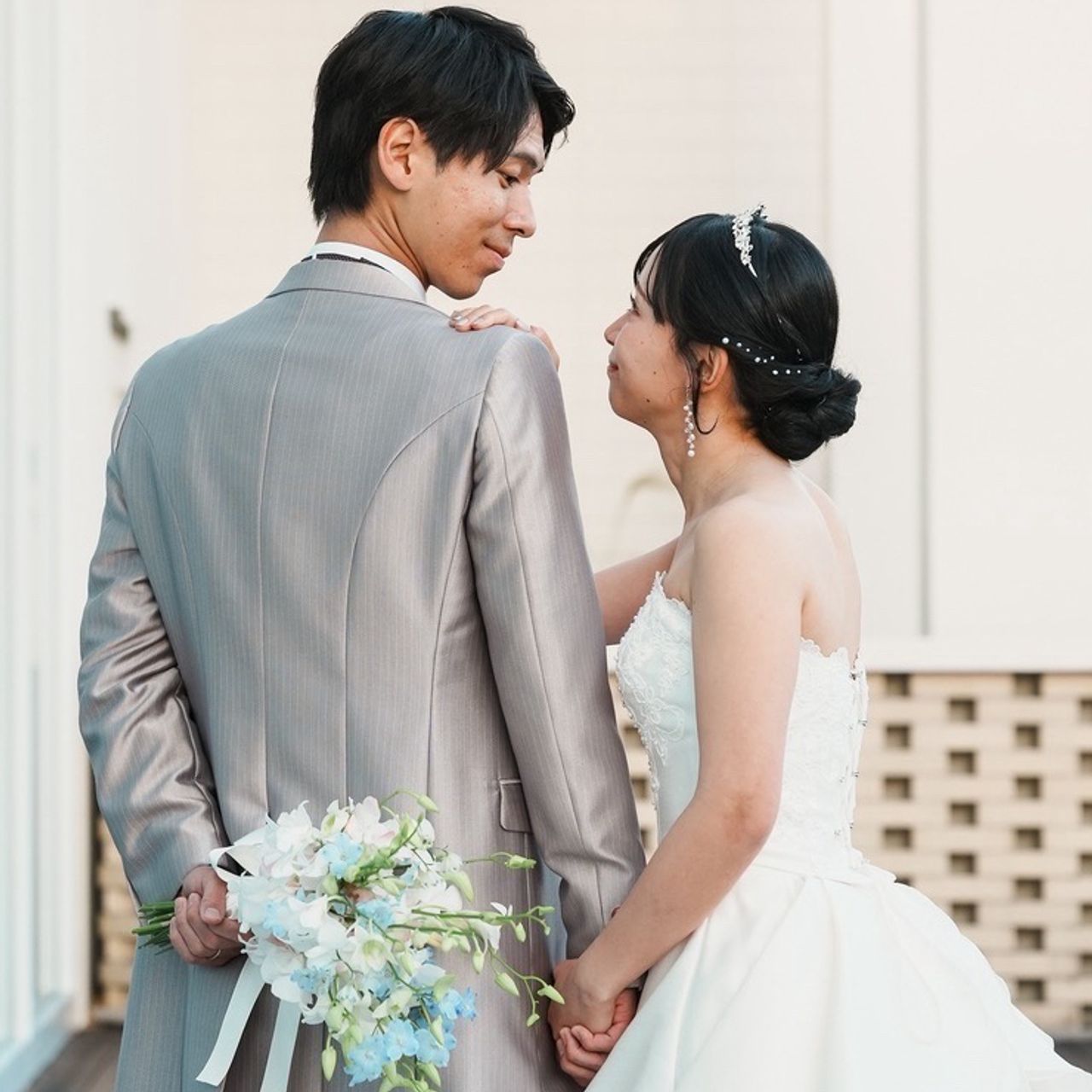 薄いブルーからホワイト、シルバーの色味で、どちらの衣装にも合うようにしました。