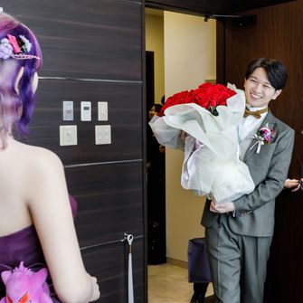 お色直しでは、旦那は緑のタキシードの肩にヨーギラスを乗せ、私は紫のドレスの腰にゲンガーを付け、二人らしさを表現しました。