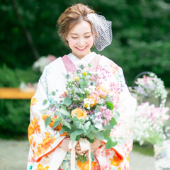 緑豊かな中に色打掛の色合いやブーケ、装花のコントラストが映えて素敵な写真が残せました。