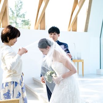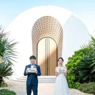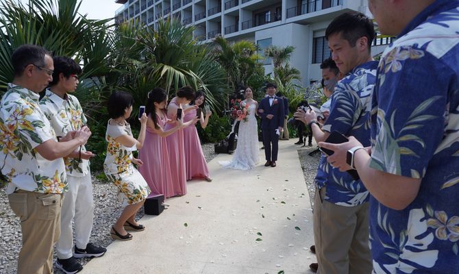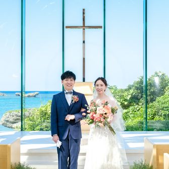 沖縄の海沿いにあり、ホテル婚でありつつも木の温かみが感じられるところが魅力的な教会だったので"ナチュラル"をコンセプトにしています。親族+友人少数の少人数婚だったので、ゲスト衣装をかりゆしにして、統一感やナチュラルさを出しました。ゲストとの距離が近い式を挙げることができました!