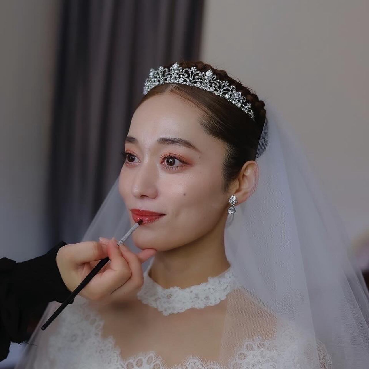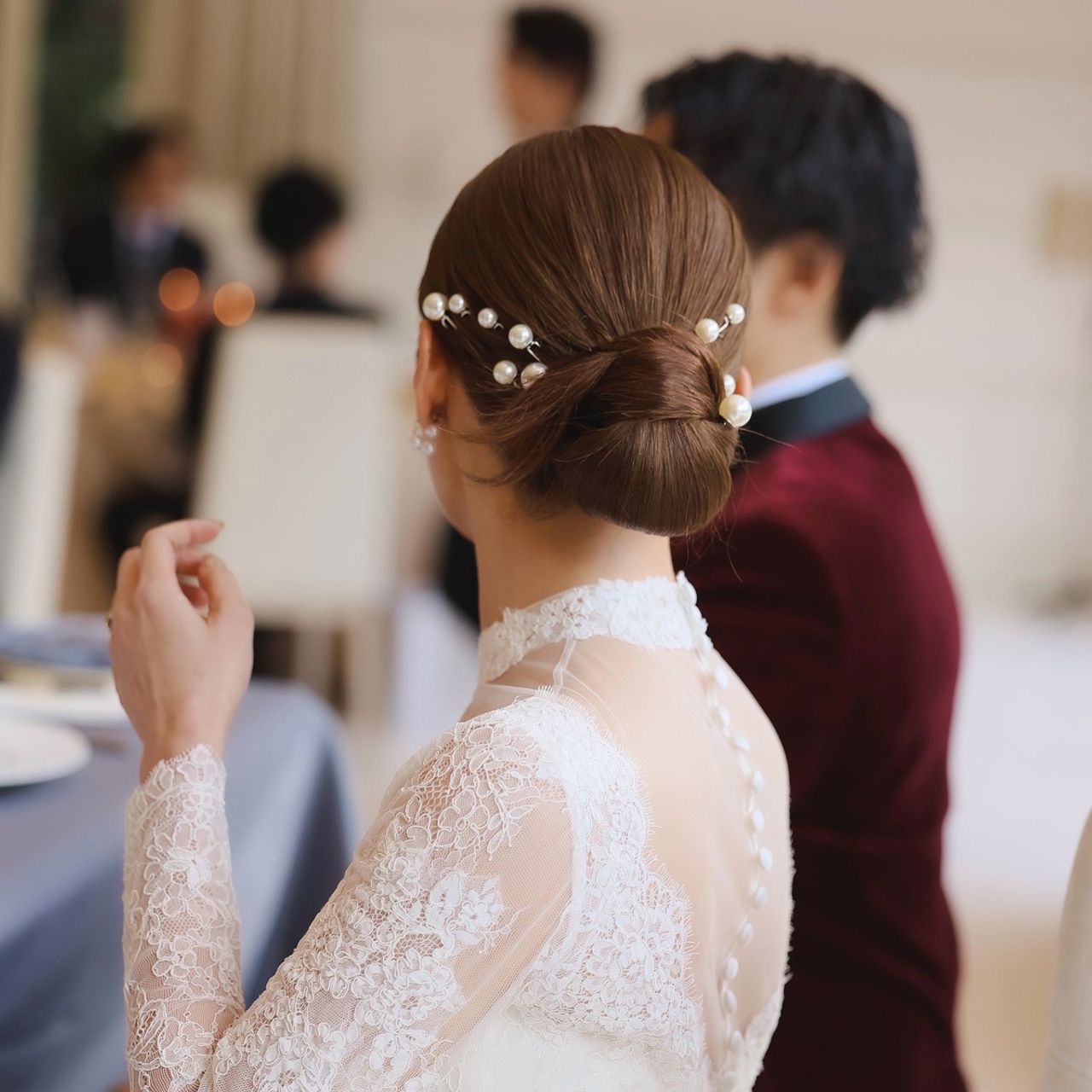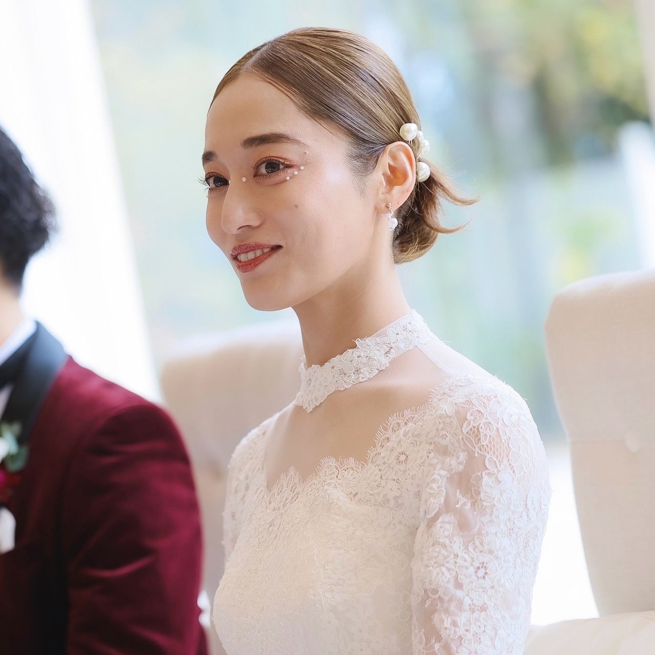 挙式は大きなティアラをつけています💚🍃挙式後は、髪型とメイクのみ変えました。髪と目元にパールをつけて、挙式の時とはイメージが変わるようにしました🦪🤍