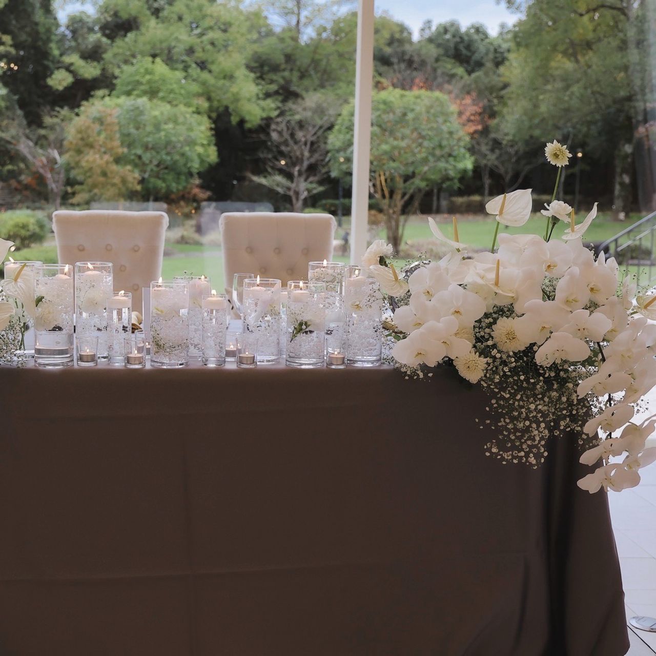 高砂のお花は胡蝶蘭をメインにして華やかに、そして真ん中には水中花を置きました🤍
