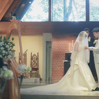 コロナの影響を考慮し挙式に来ることが出来なかったお互いの親族のために、挙式はLive配信で離れた場所からも見て貰えるようなプランを付けました。また、式後には教会の外の緑の中で写真撮影を行い、とても素敵な写真を撮っていただきました。