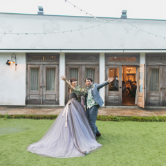 シンボルツリーや緑の芝生がとても素敵なガーデンでした。生憎、挙式のタイミングで雨が降ってしまったのですが、式場が用意してくださった傘もとても可愛く、緑とのコントラストも良い感じで、ロマンチックな写真が残せて満足です。途中雨が強くなったため、Barn(屋内挙式会場)に移動しパントスや写真撮影を行いました。
