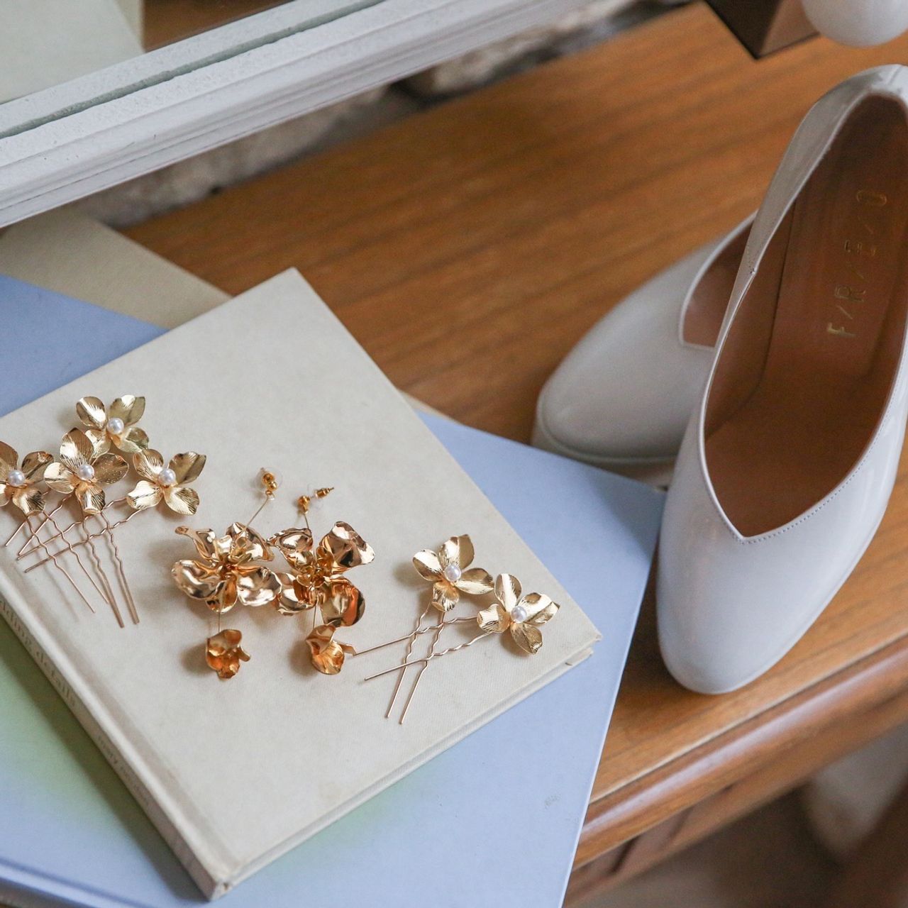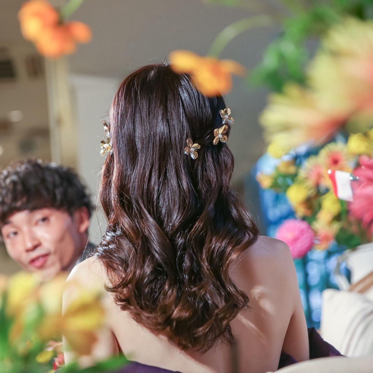 カラードレスでは、ピアスに合わせてゴールドの花のピンを着けてアクセントを加えています。