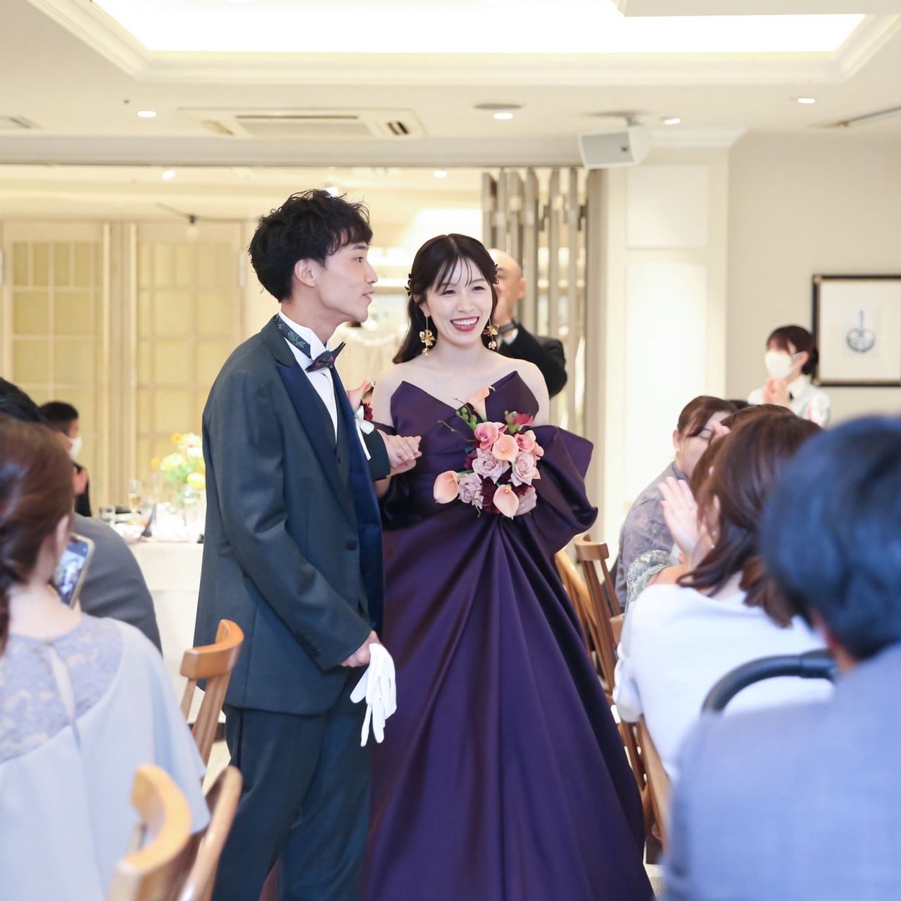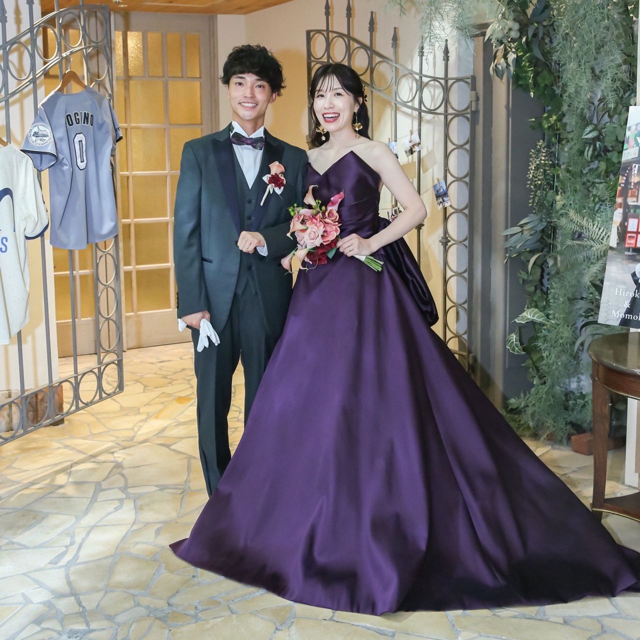 深みのあるパープルが上品で大人っぽく、オフショルダーでデコルテがきれいに見えるところに惹かれました。