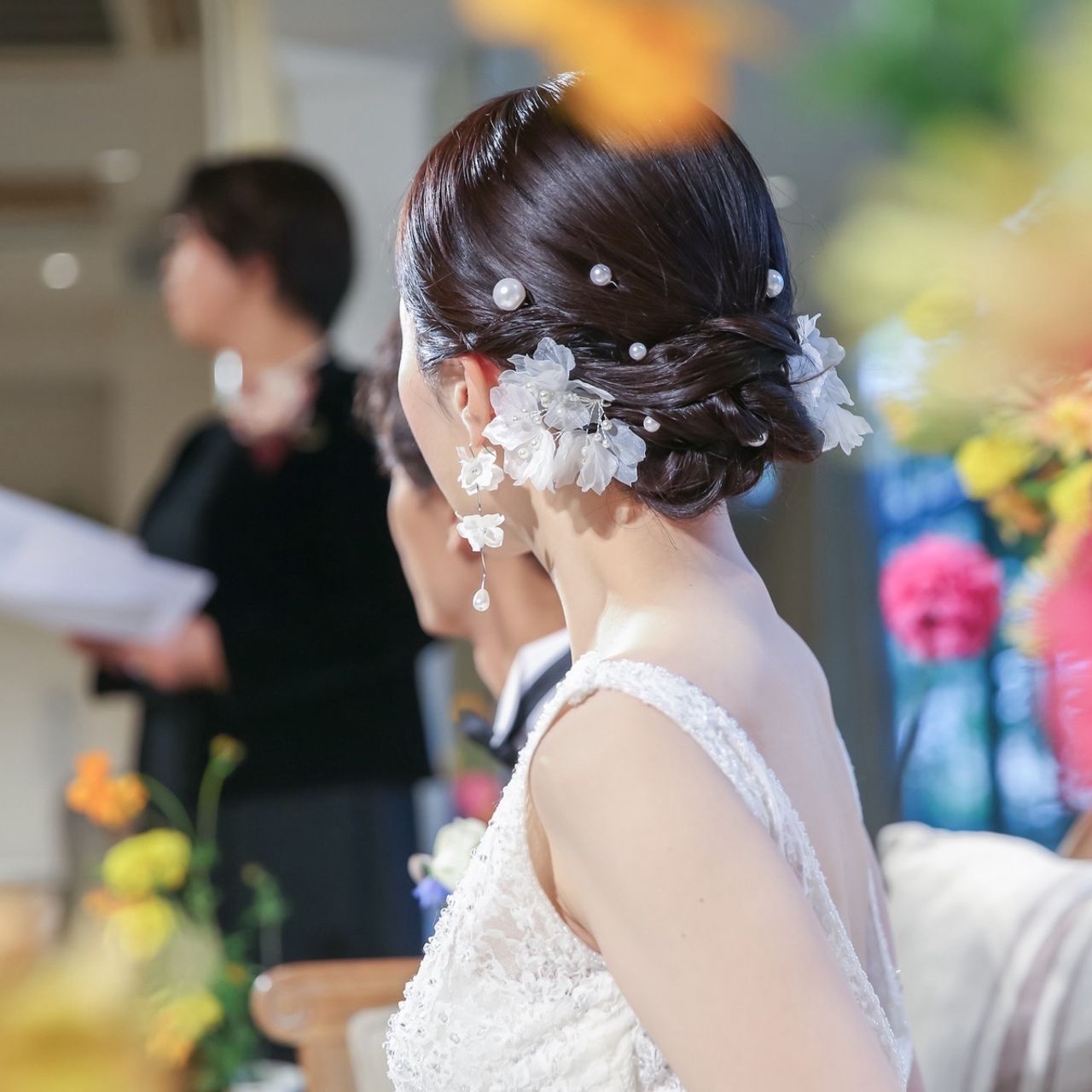 披露宴の前半はドレスはそのままに、白い花が連なったロングピアスで華やかさを加え、雰囲気を変えています。