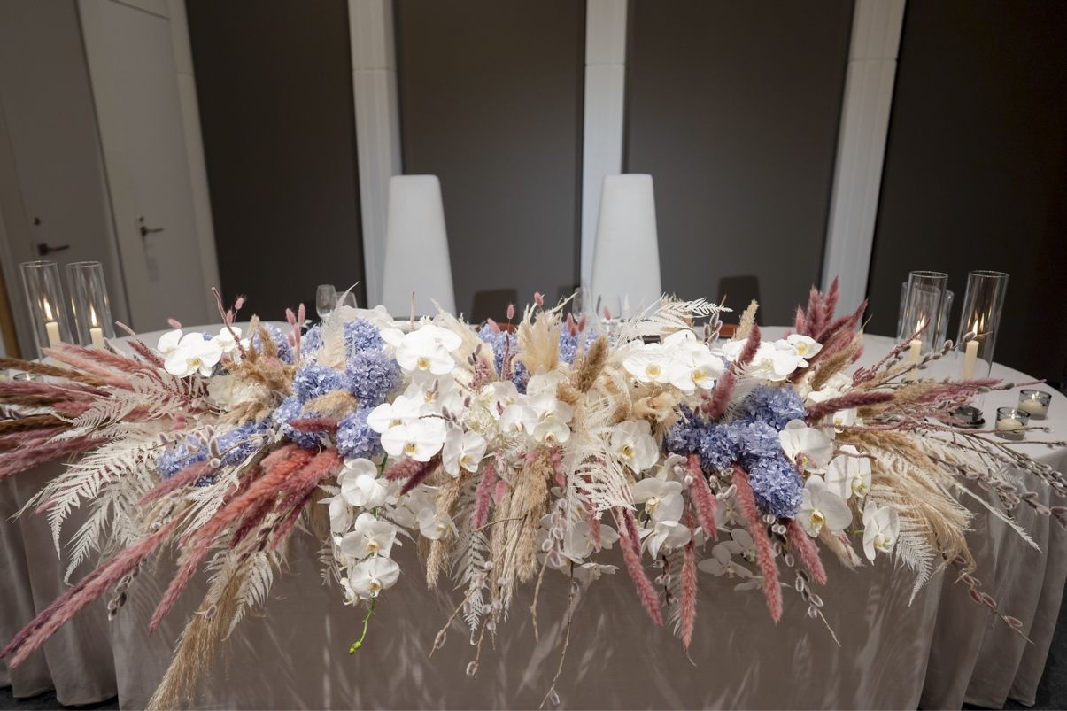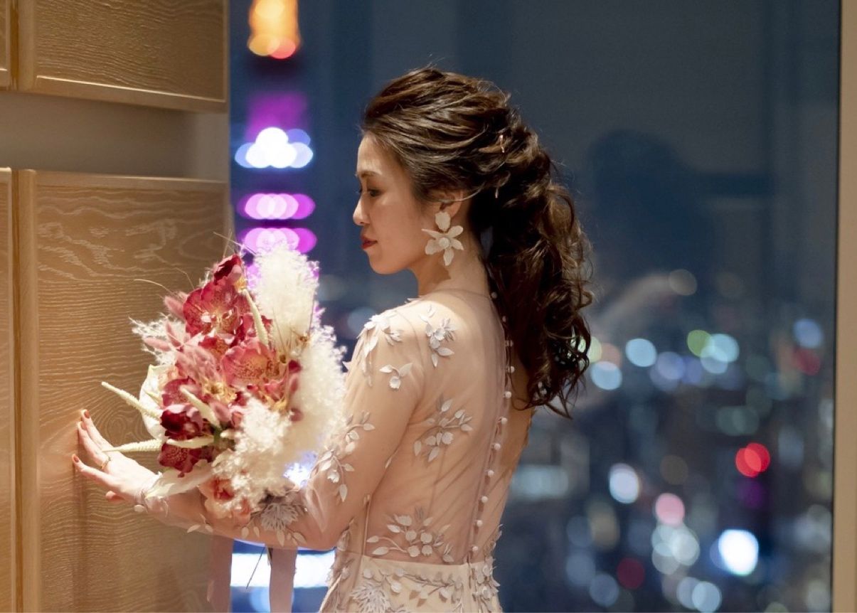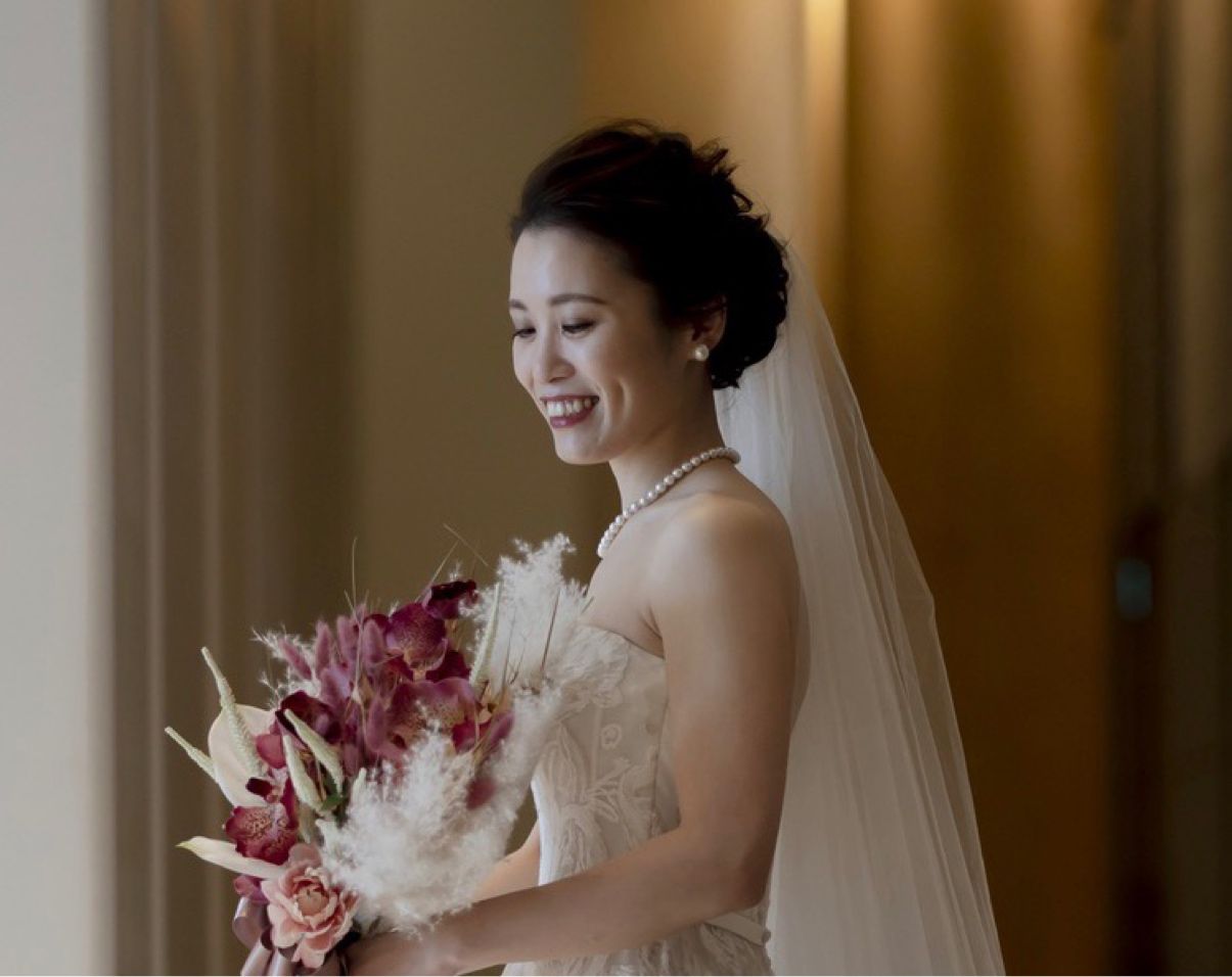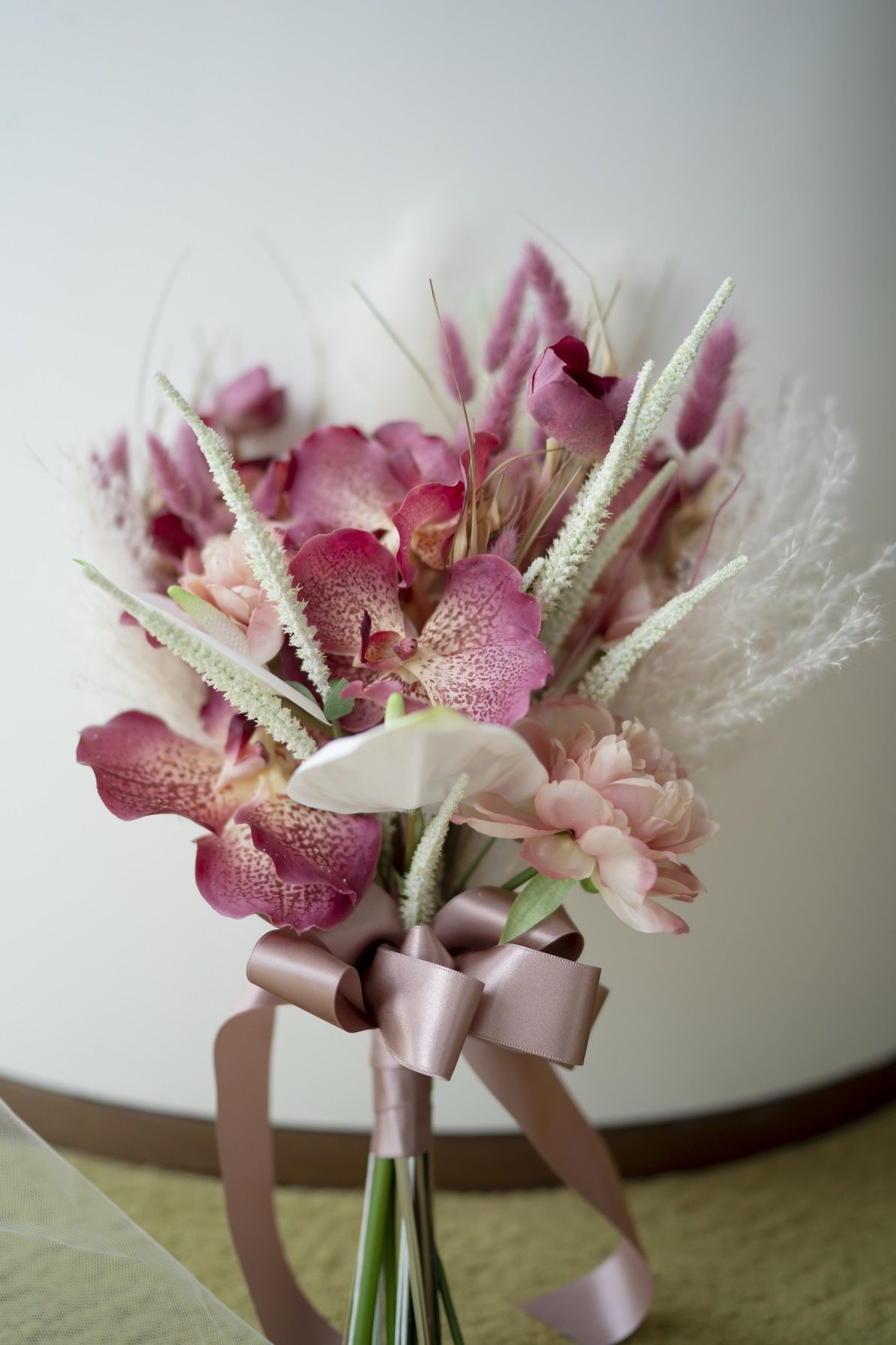ブーケは結婚式の象徴的なアイテムにしたかったので、とびきりお洒落なものを一つだけにして、濃いピンクの花を中心にパンパスグラスで縁取りした造花にしました。