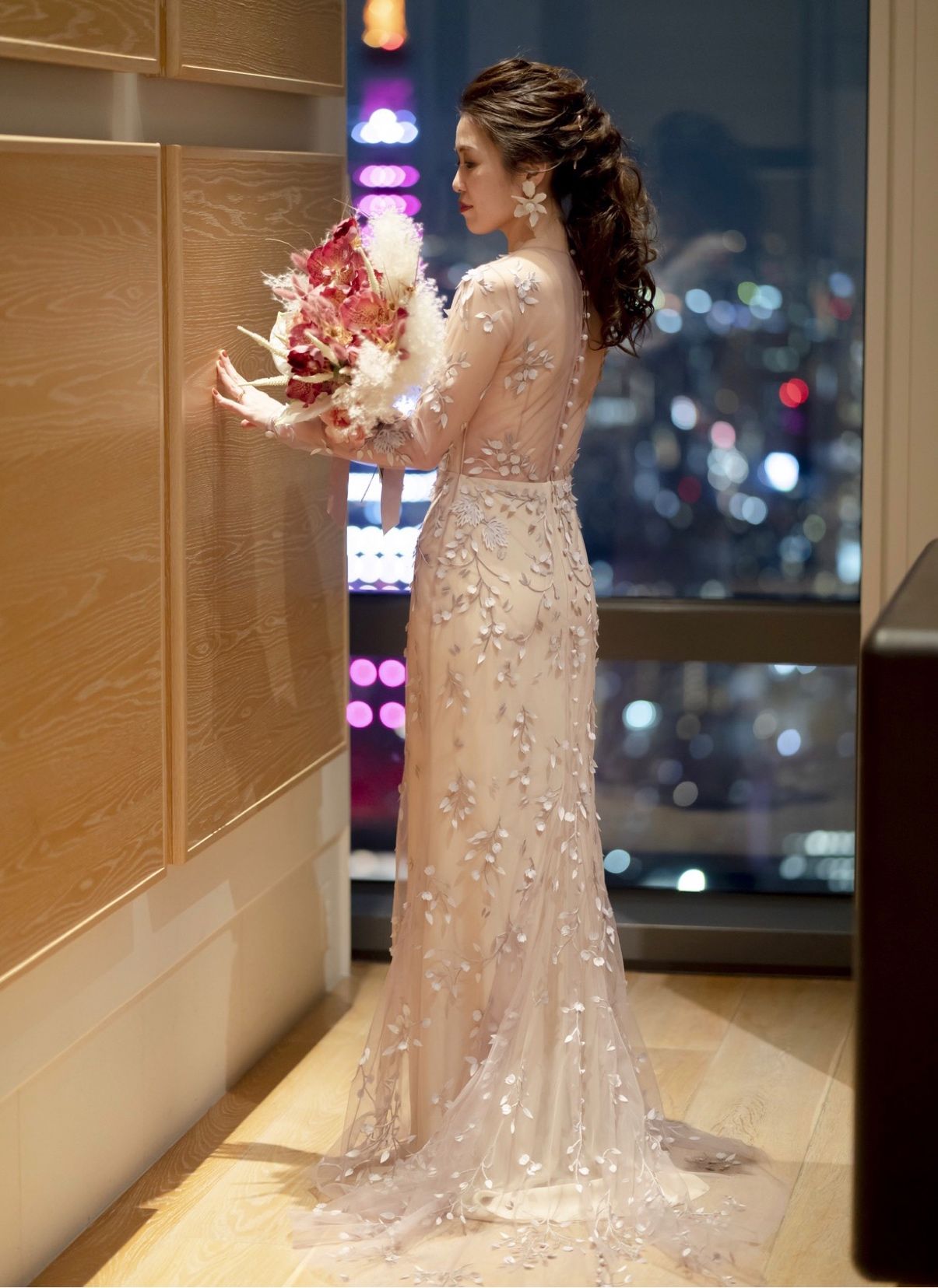 スレンダーなラインと繊細な色(ベージュに紫のチュール)が決め手でした。