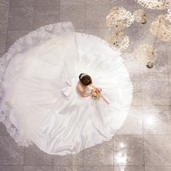 長いバージンロードに映えるロングトレーンが決め手です!ミカドシルクで正統派な雰囲気を大切にしつつ、トレーン部分はチュールとレースで透け感がかわいいドレスを選びました。