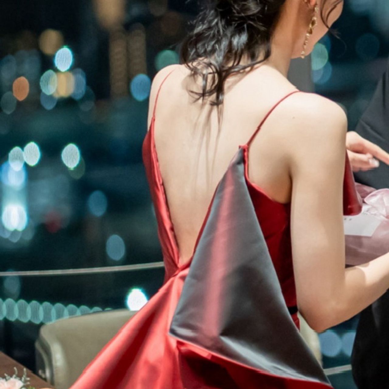 パキッとした赤色が目を引くドレスで、背中には個性的なフリルがあしらわれています。黒が締め色として加わることで、可愛らしさの中にもゴージャスさが感じられる一着になりました。