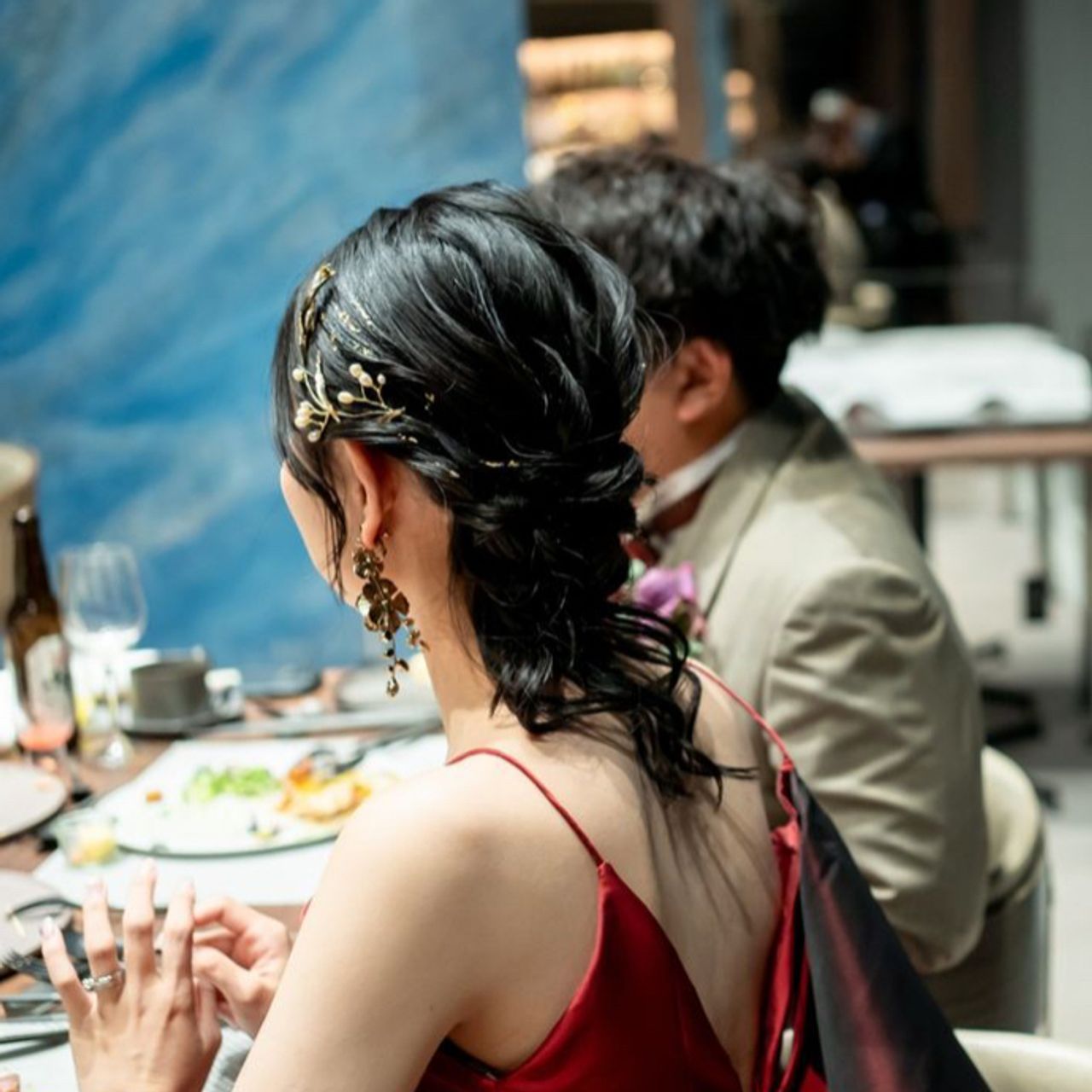 カラードレスでは、ドレスのバックスタイルをより美しく見せたかったので、アクセサリーも後ろにポイントが来るデザインを取り入れています。