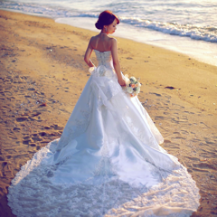 ウエディングドレスは、サウスハーバーの暗い星降るチャペルに映えるよう、トレーンの長いキレイなものを選びました