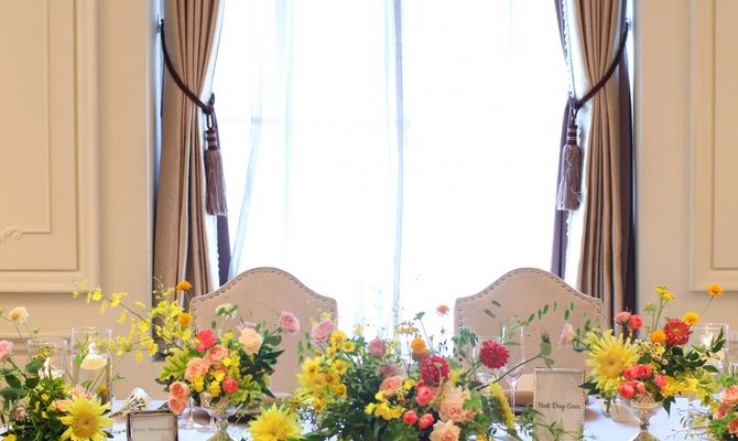 夏の結婚式だったので、色やお花、BGMなど夏らしいアイテムを取り入れました*
