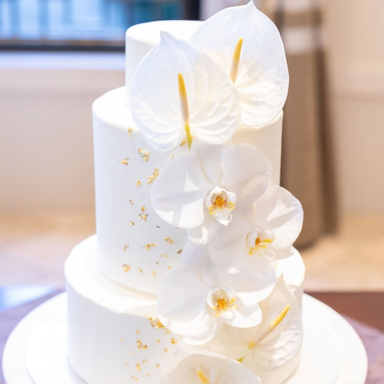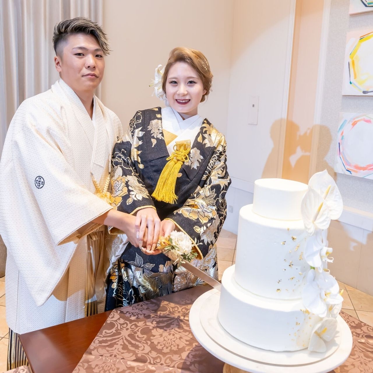 和装に合わせて、真っ白のケーキに胡蝶蘭が乗っているものにしました!