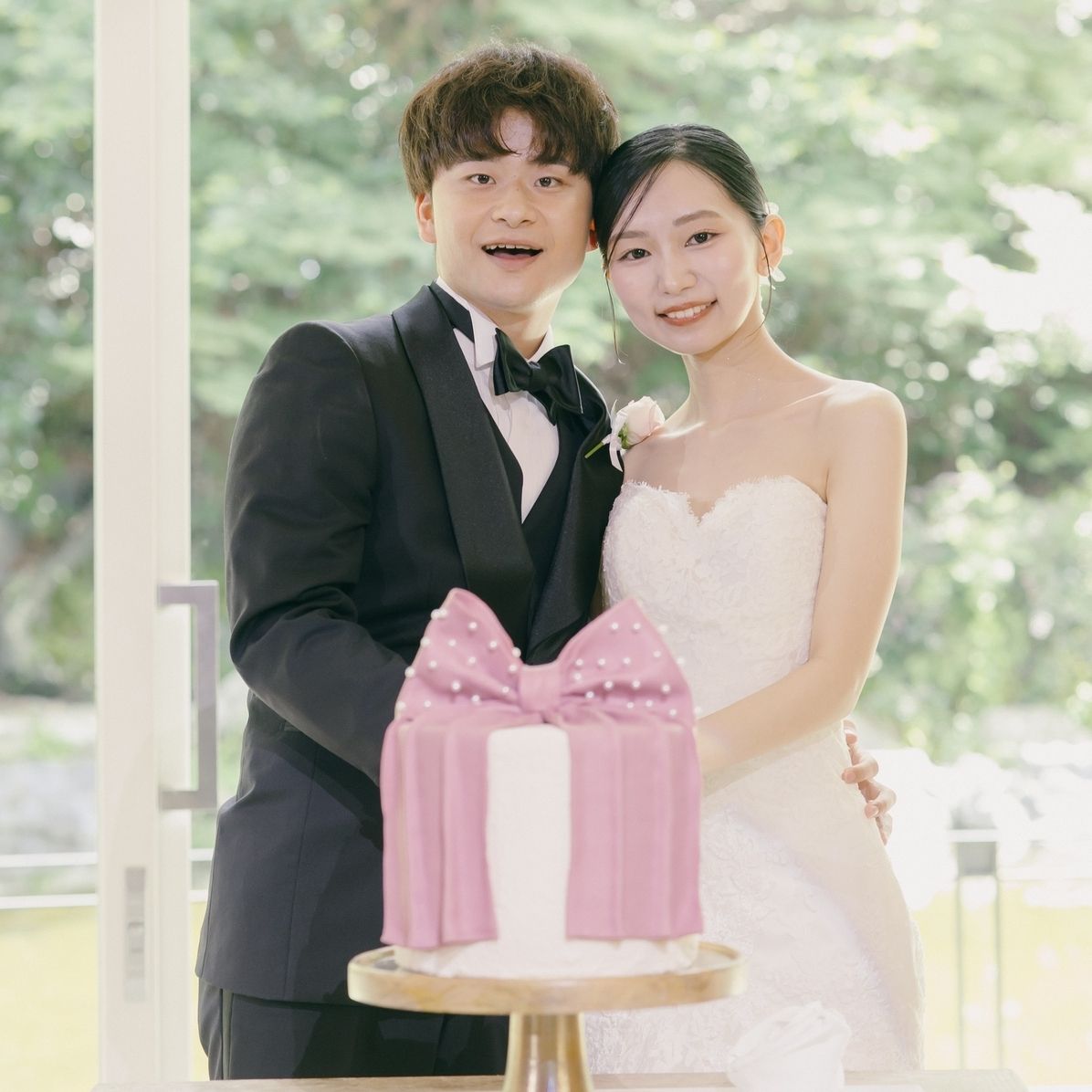 大きなピンクのリボンがついたケーキです。せっかくならあまり見たことのない形にしたいと思いPinterestで海外のケーキのアイディアを参考にパティシエさんに作成いただきました。