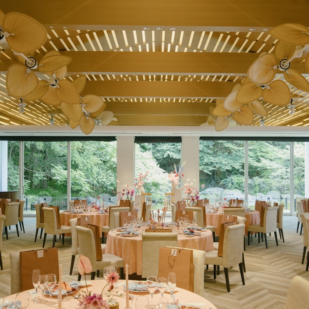 窓が大きくて自然光が多く入るのがとてもよかったです!雨の日でも会場を囲っている木々の色味が深まって素敵なので、当日は晴れ予報でしたが雨でも雰囲気が変わって素敵だっただろうなと思います。