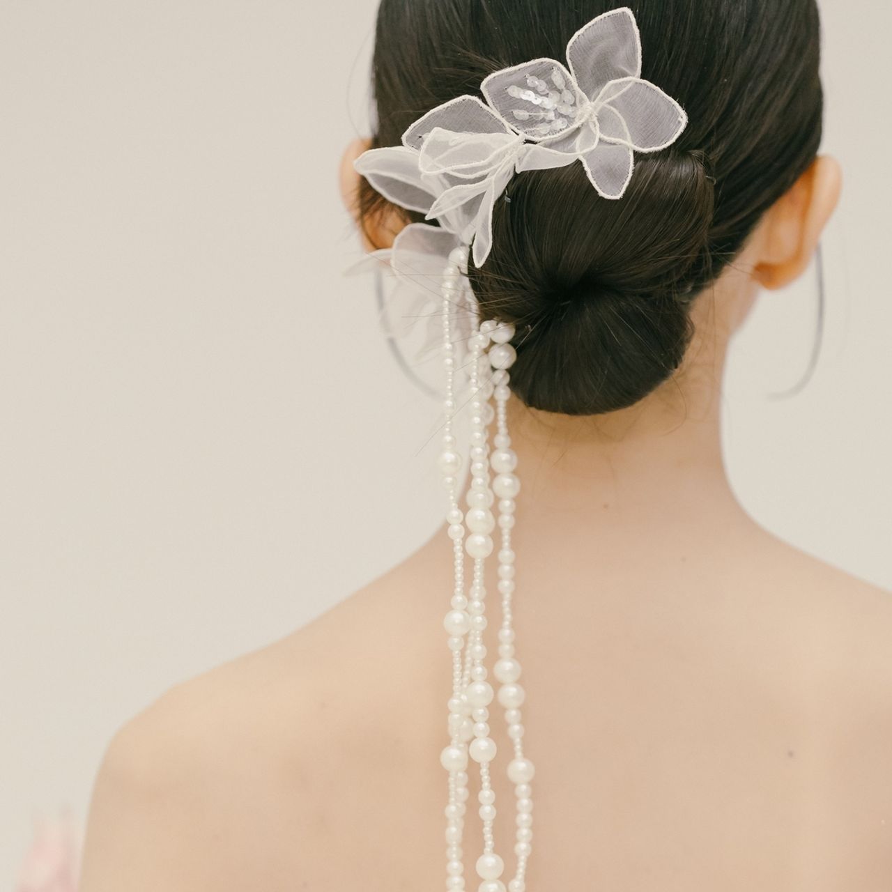 1着目の時はスパンコールを使って作った白いお花のパターンと、パールが垂れ下がったデザインのもの。2着目の時は黒いベロアリボンにパールを縫い付けたものを使用しています。