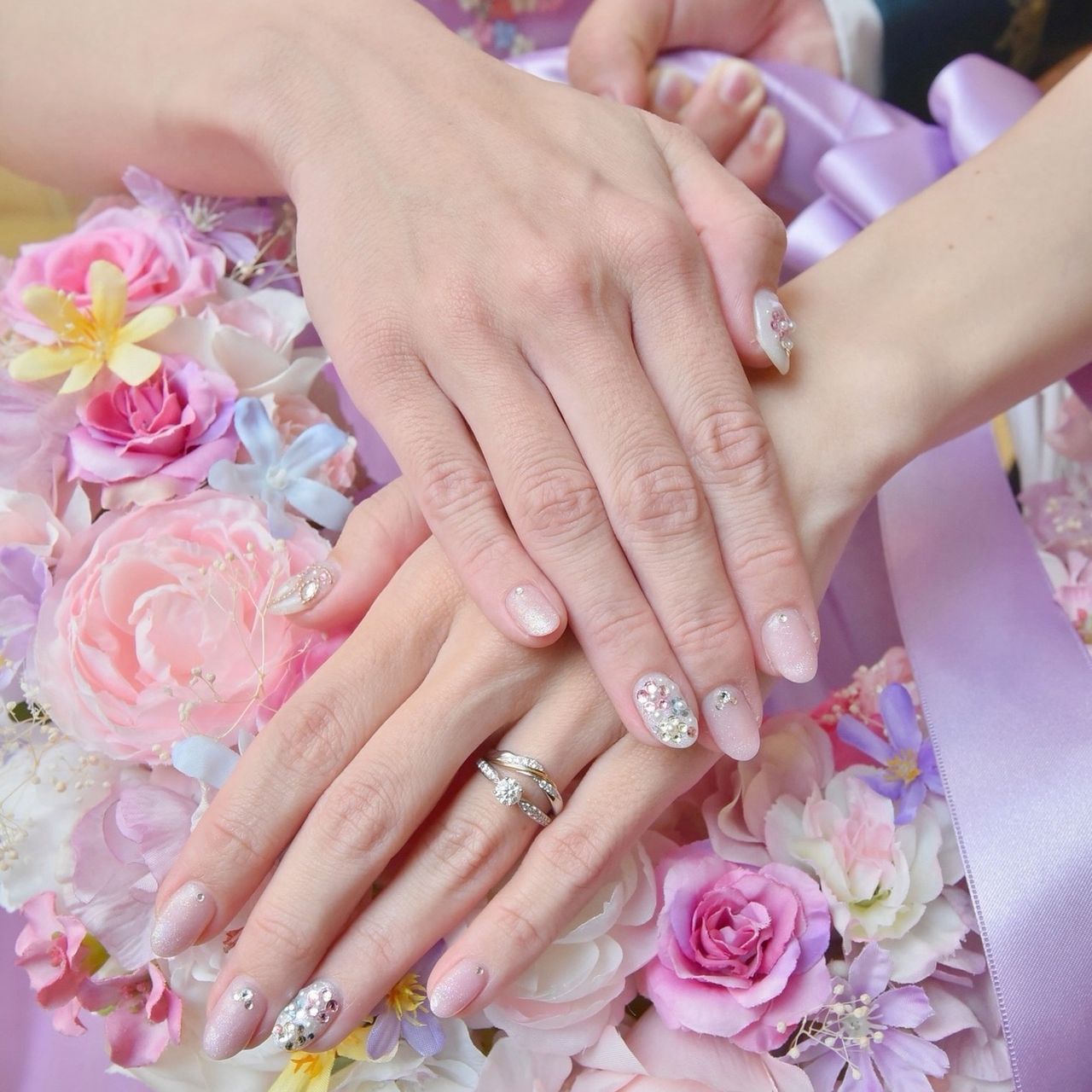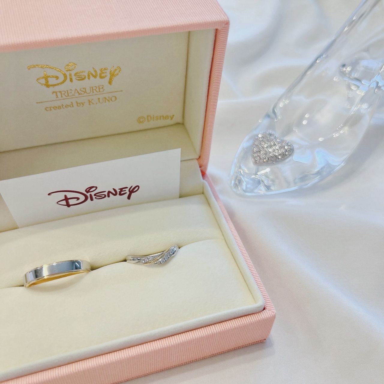 新婦…リングの形は小さい頃から大好きなふわっと広がるドレスの裾をイメージ。キラキラと輝く8つのダイヤモンドのうちの真ん中のダイヤモンドは「Two-as-one-Diamond」と言って、1つのダイヤモンド原石をふたつにカットしたもので、もうひとつは彼の指輪の内側についています。リングの内側には、プロポーズの日にガラスの靴もプレゼントしてもらったことからガラスの靴を刻印しました!