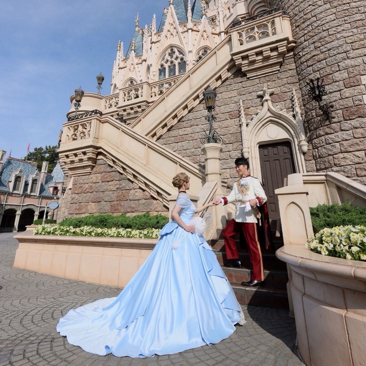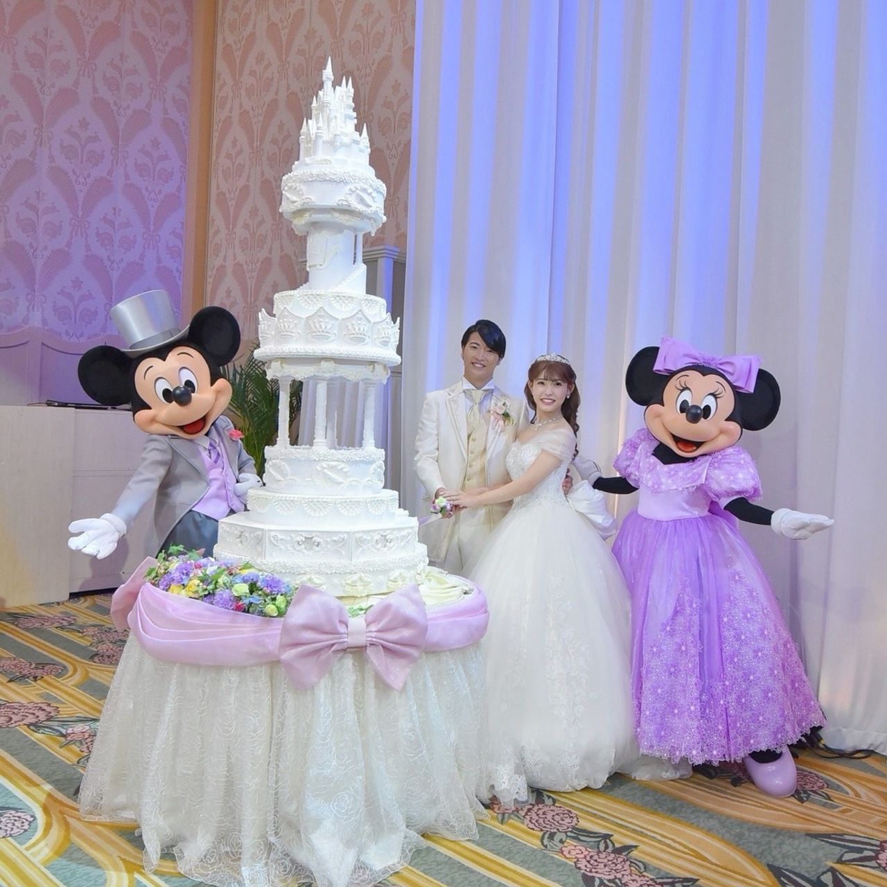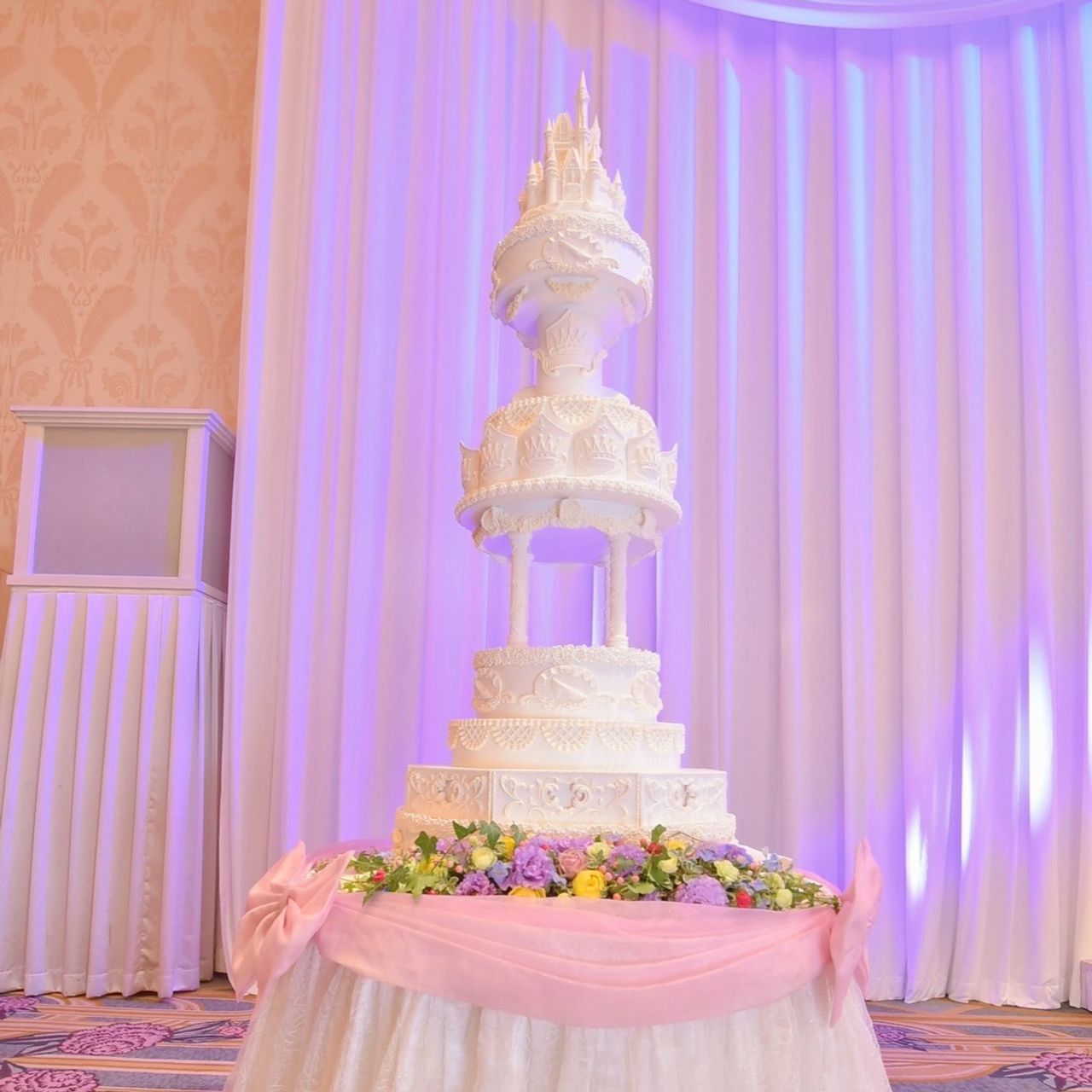 ラプンツェルのケーキもありましたが、ウェディングドレスのこだわりもあったので高さがあって迫力のある “シンデレラ城” モチーフのケーキを選びました。前撮りでパークのシンデレラ城前での撮影もした為、その思い出も共に…♡