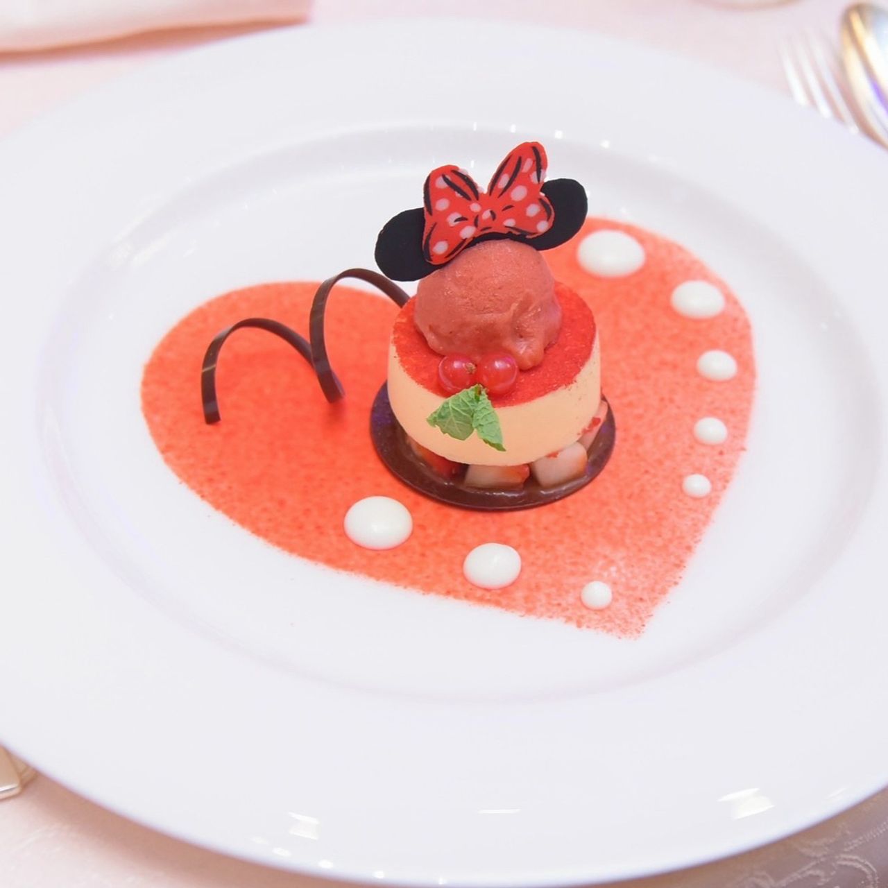 全てのお料理がカスタマイズできるコースを選び、実際にテイスティングして選びました。デザートはミニーちゃんのデザートを選びました。大きなハートの真ん中にミニーちゃんモチーフのケーキがあってとっても可愛くて美味しくてお気に入りです。
