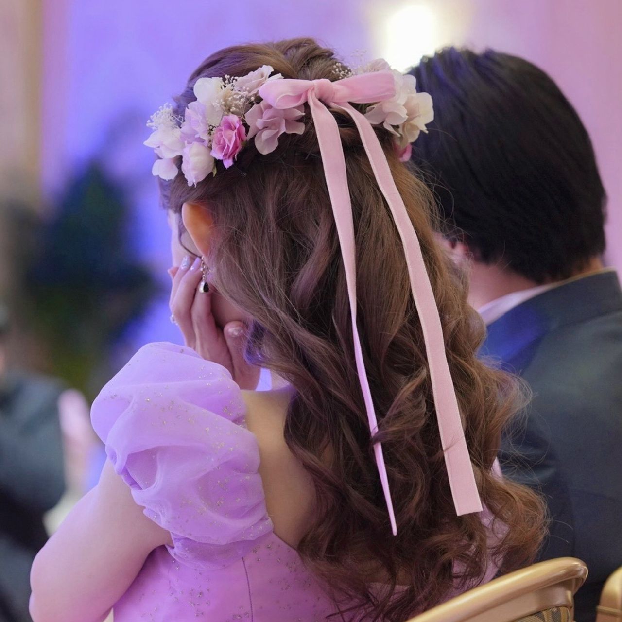 お色直しではセンター部分に少し編み込みを入れたハーフアップスタイルにしています。