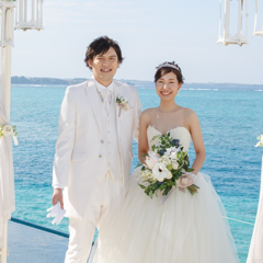 海に浮かぶチャペルはナチュラルテイストで、目の前に広がるオーシャンビューは感動の美しさでした!