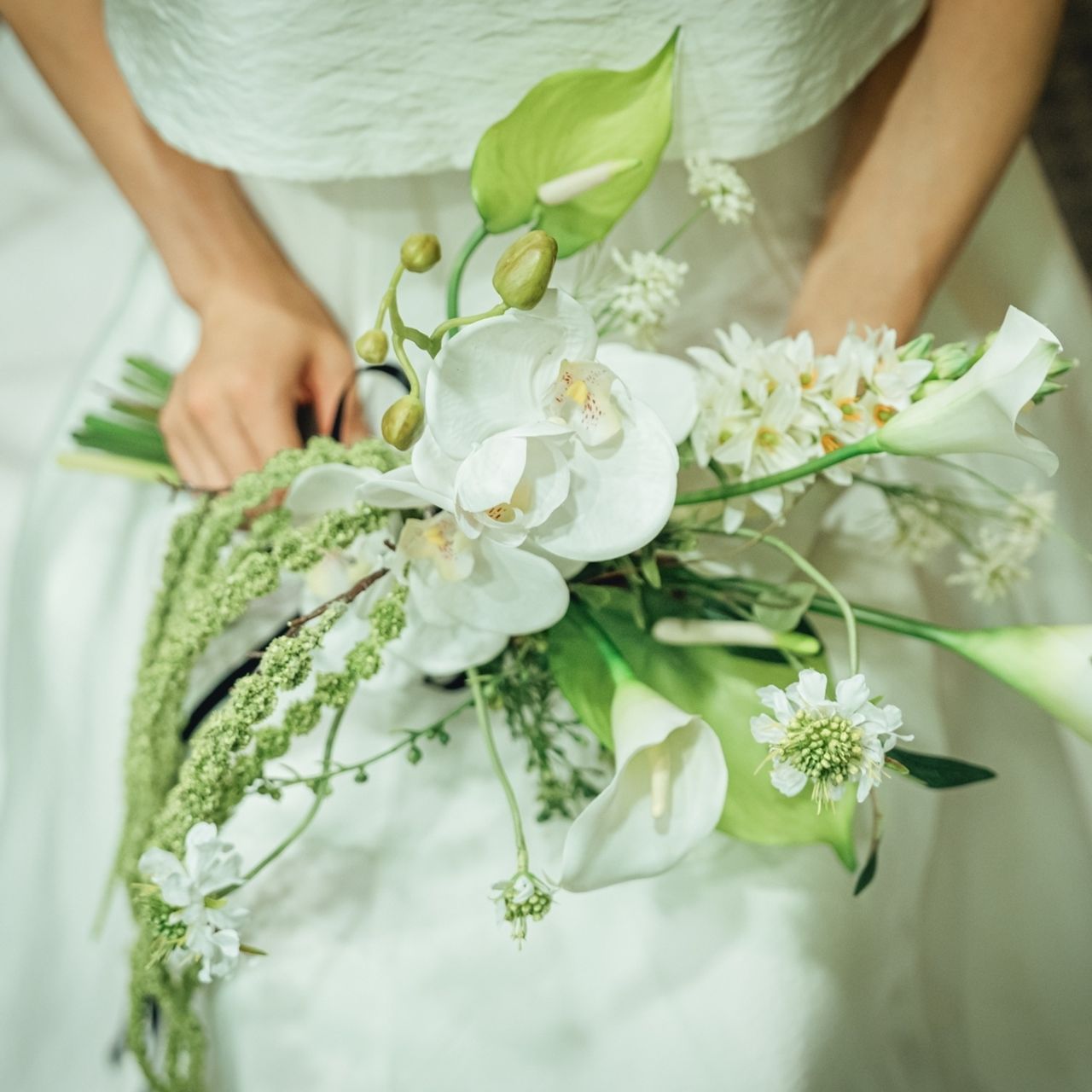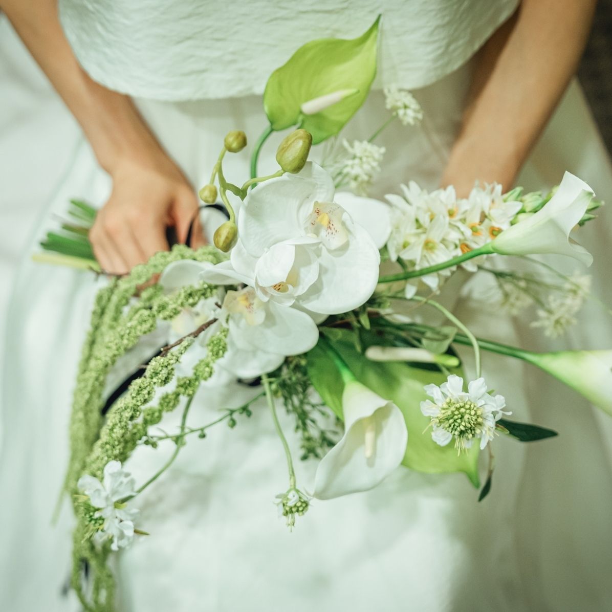 ブーケはアーティフィシャルフラワーです。Instagramで見つけたフローリストさん(@monisopo_flower)に作成していただきました。
