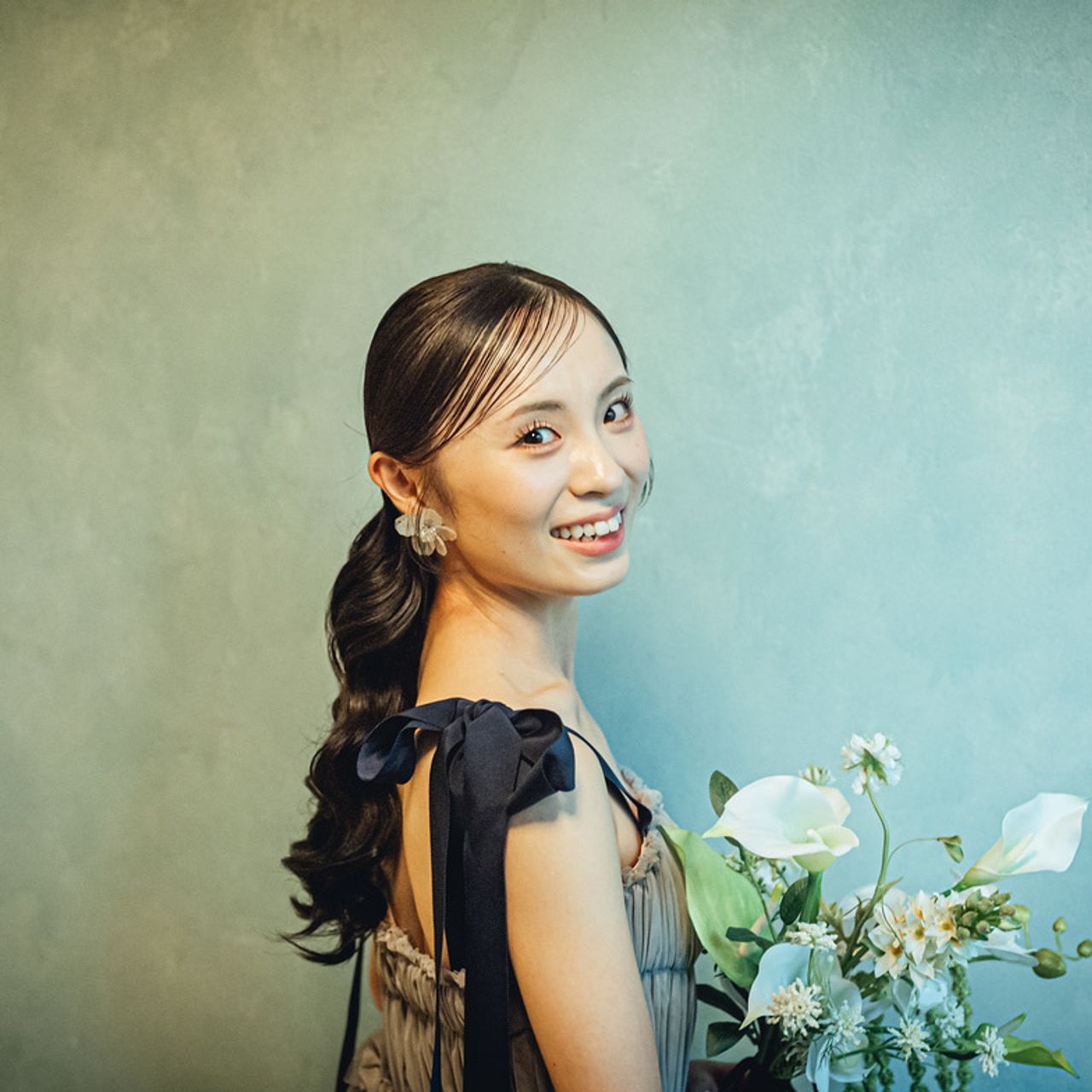 一方、カラードレスでは肩にリボンのデザインがあるため、全体のバランスを考えてすっきりとした印象になるよう、垂れないタイプの大ぶりなお花のピアスを合わせています。こちらはヘアメイクさんにお借りしたもので、ドレスの雰囲気にもぴったりでした。