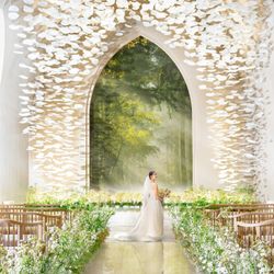 堂々完成!新たな祝福の空間が誕生。【新チャペル】見学スタート! 天井から降り注ぐような花びらのオブジェと緑の設え。柔らかな光が緑に反射し、輝きが全体を包み込む。都心にありながら自然が織りなす洗練空間。