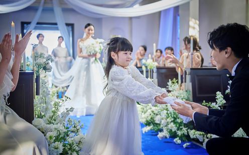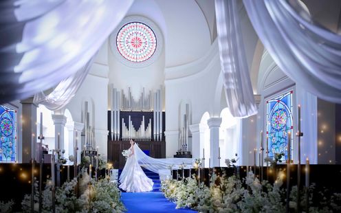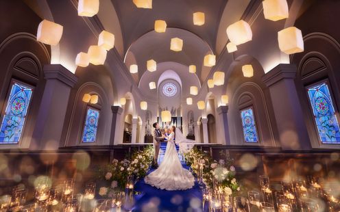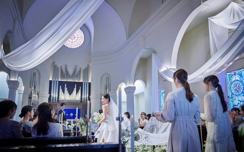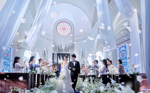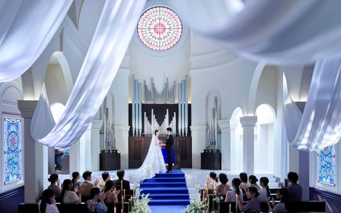 ロイヤルブルーのバージンロードが映える白亜の大聖堂で感動のチャペルセレモニーを