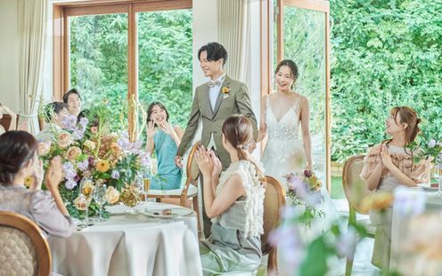 吹抜けの明るい空間に、木の温もり感じるヨーロピアンテイストの貸切邸宅。大切なゲストと特別な時間を過ごせる、くつろぎのパーティ会場です。1年中いつでも花々や緑を楽しめるよう、手入れされたプライベートガーデンでは演出も自由自在。ウェルカムパーティや、パーティ後半にガーデンへ移動して人気のデザートビュッフェ、写真撮影など、想い出に残るひとときをお過ごしいただけます。また、一つのテーブルをみんなで囲む家族会食も可能です。気軽にお問い合わせください。