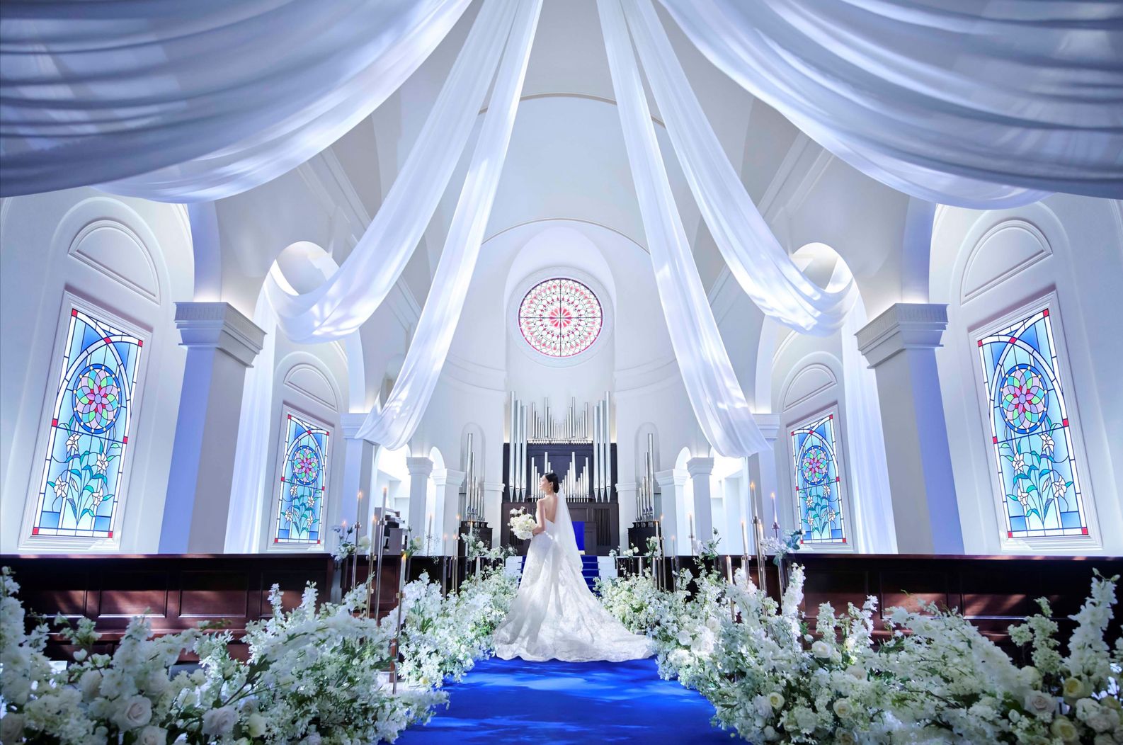01.【白亜の大聖堂】ロイヤルブルーのバージンロードが印象的!屋外でアフターセレモニーを