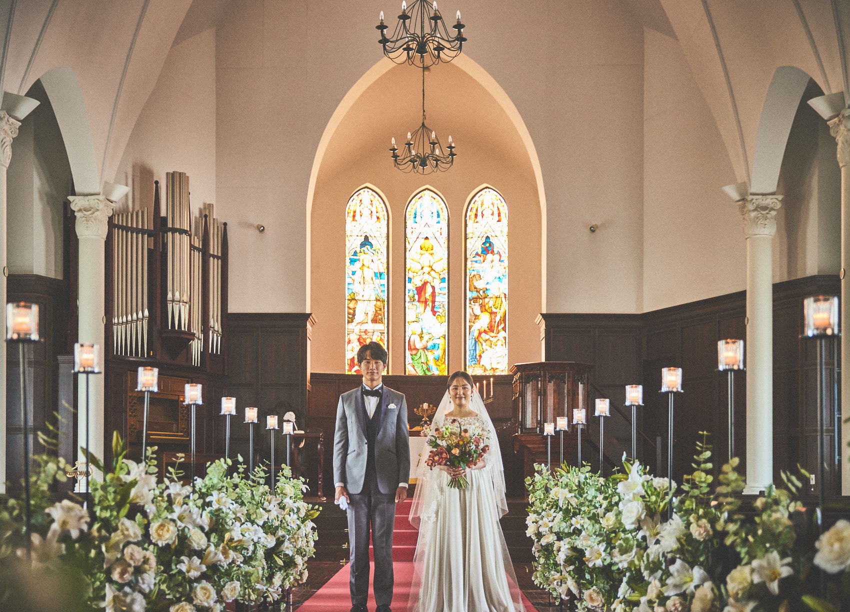本番と同様の流れで モデルが入り挙式を行うイベントです。入場、賛美歌斉唱、指輪交換、誓いのキス、退場まで行うことが一般的で、所要時間は30分程度が多いです。ゲスト目線を体験できるのがメリットで、自分達の挙式のイメージを描くことができます。