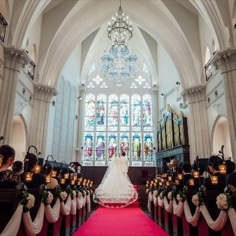 本番と同様の流れで モデルが入り挙式を行うイベントです。入場、賛美歌斉唱、指輪交換、誓いのキス、退場まで行うことが一般的で、所要時間は30分程度が多いです。ゲスト目線を体験できるのがメリットで、自分達の挙式のイメージを描くことができます。