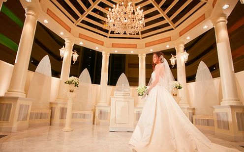 純白のウエディングドレスが最も映えるよう壁とチェアがブラウンに施され、白い大理石のバージンロードに花嫁姿が美しく映える気品あるチャペル。聖歌隊の歌声と演奏が響き渡る音とともに感動が大きく膨らむセレモニーが執り行われます。