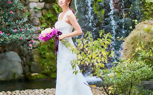 滝の流れる日本庭園はドレスも和装も絵になる空間。ゆったりとした時の中で想い出の一枚を残してみては。