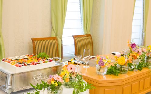 ゲスト席との距離が近く、あたたかな雰囲気に包まれるパーティ会場。言葉や笑顔を交わしながら過ごせる、アットホームな空間が魅力です。ゲスト一人ひとりとの会話を大切にした、心に残るひとときを叶えます。