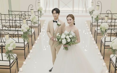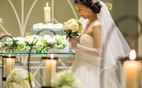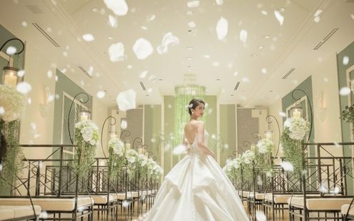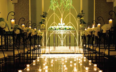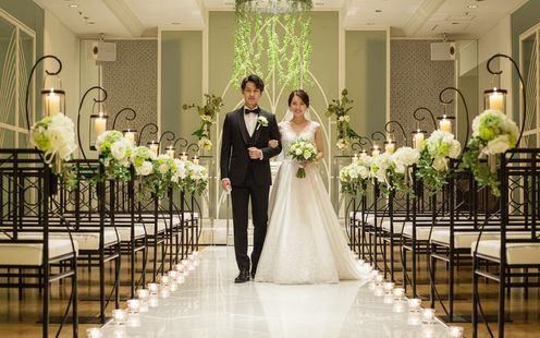 祭壇には天使の輪を思わせる印象的な照明が配され、神聖でやさしい空間が広がります。パイプオルガンの重厚な音色が響き渡る中、感動の誓いを叶えて。人前式では、幻想的な雰囲気を演出する「キャンドルセレモニー」や、両家の水を合わせてクリスタルタワーを完成させる「ブライトセレモニー」、新郎がゲストから花を集め新婦へ贈る「フラワーセレモニー」など、ゲスト参加型の多彩な演出を実現できます。