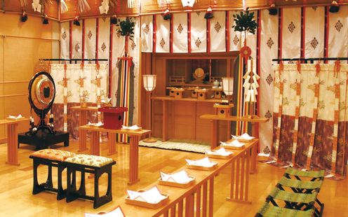 木目を活かした落ち着きある神殿。出雲の伝統を受け継ぐ、本格的な神前式が人生の節目を彩る