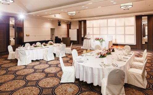 | その他 | スタッフより「人数に応じた多彩なレイアウトを実現できます。結婚式後、ご宿泊やレストラン等、当ホテルの施設やサービスのご利用に際し、様々な特典をご用意しています」 |