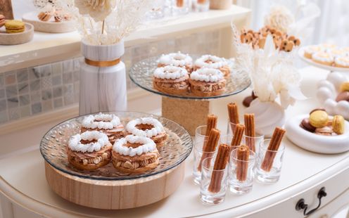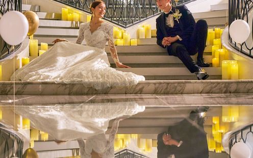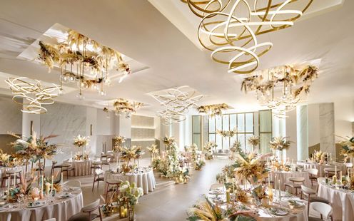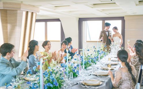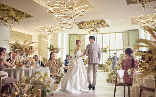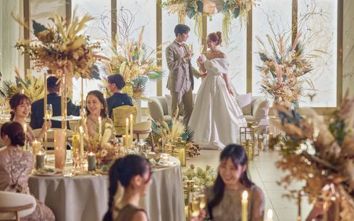 開放感あふれる最上階のフロアを貸切にできるプライベートバンケット。自然光ときらめくウォーターカーテンが印象的な会場です。少人数婚だからこそ料理にはこだわりたい、そんなふたりの希望を叶えられるよう、専属シェフと相談してオリジナル料理をふるまうことも可能。オープンキッチンからサービスされる出来立てのお料理に、自然と会話がはずむアットホームなパーティが叶います。
