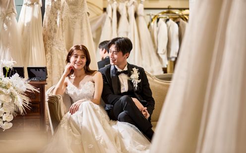 新作、デザイナーズブランドのものまで、400着以上の豊富なドレスを常時用意しております。ドレスも和装も、気になる方にも。全て揃っているから、お打ち合わせと同じ施設内でじっくりお選びいただけます。また、タキシード専用サロンや親御様衣装もあるので安心です。