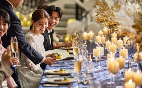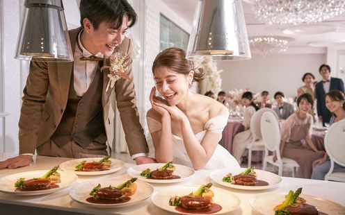 「お箸で食べられる」とご年配のゲストにも人気の折衷料理はもちろん、新郎の出身地の食材と新婦の出身地の食材を組み合わせた創作メニューや、両親が作ってくれた思い出の味、ふたりの出会いにまつわるお料理の再現など、人生が伝わるオリジナル料理の演出も。